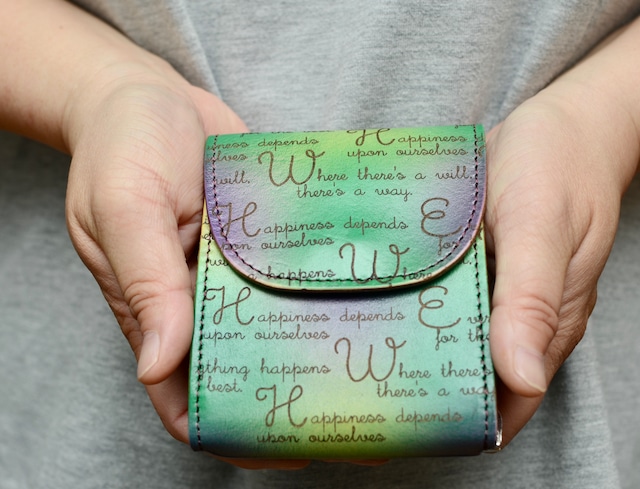 革工房Rickiey[リッキー]オリジナルのフルーティ染めを施した革に、ポジティブな言葉を彫り込んだミニ財布です。 【商品説明】 キャッシュレス決済や、女性のミニバッグでのおでかけなど、現代のライフスタイルにフィットするミニウォレットです。小さいサイズですが、収納力と機能性に優れています。 ・カード入れがPAT.(パッと)取り出せる仕様です。5枚の仕切りがあり、一つのスリットにカード2枚入れも可能。その場合は10枚のカードを収納できます。 ・診察券などカードサイズより少し大きな物を入れるポケットも1つあります。 ・札ばさみがあるので札を折らずに収納可能です。 ・小銭入れも大きく開き、大容量です。 革に彫り込んでいる英文はこちらの3つです。 ぜひ、言葉からも力を感じてください! ・Everything happens for the best.(全て起こる事は最良のこと) ・Happiness depends upon ourselves.(幸せかどうかは、自分次第である。) ・Where there's a will, there's a way.(意思ある所に道は開ける) 【サイズ】 縦:11cm 横:8.5cm 幅:2.5cm (サイズは概算です) 【仕様】 コインポケット×1 / 札はさみ×1 / カード用スリット×5 / カード用ポケット×1 / 【素材】 牛革