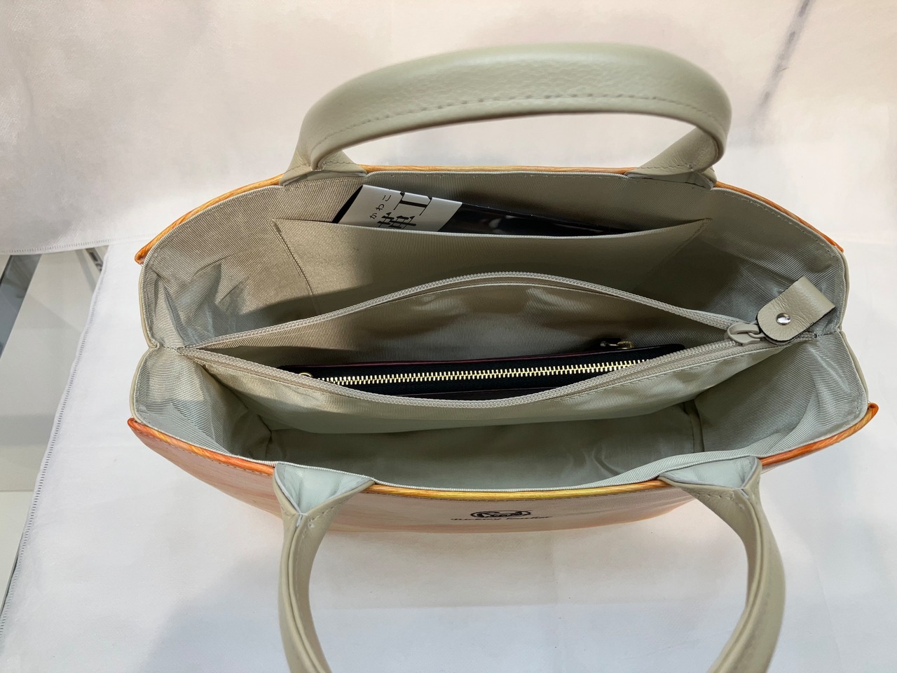 丸みのあるトートバッグです。トートバッグとハンドバッグの中間で少し可愛いデザインです。収納スペースが3つに分かれていて使い勝手は最高です‼️
