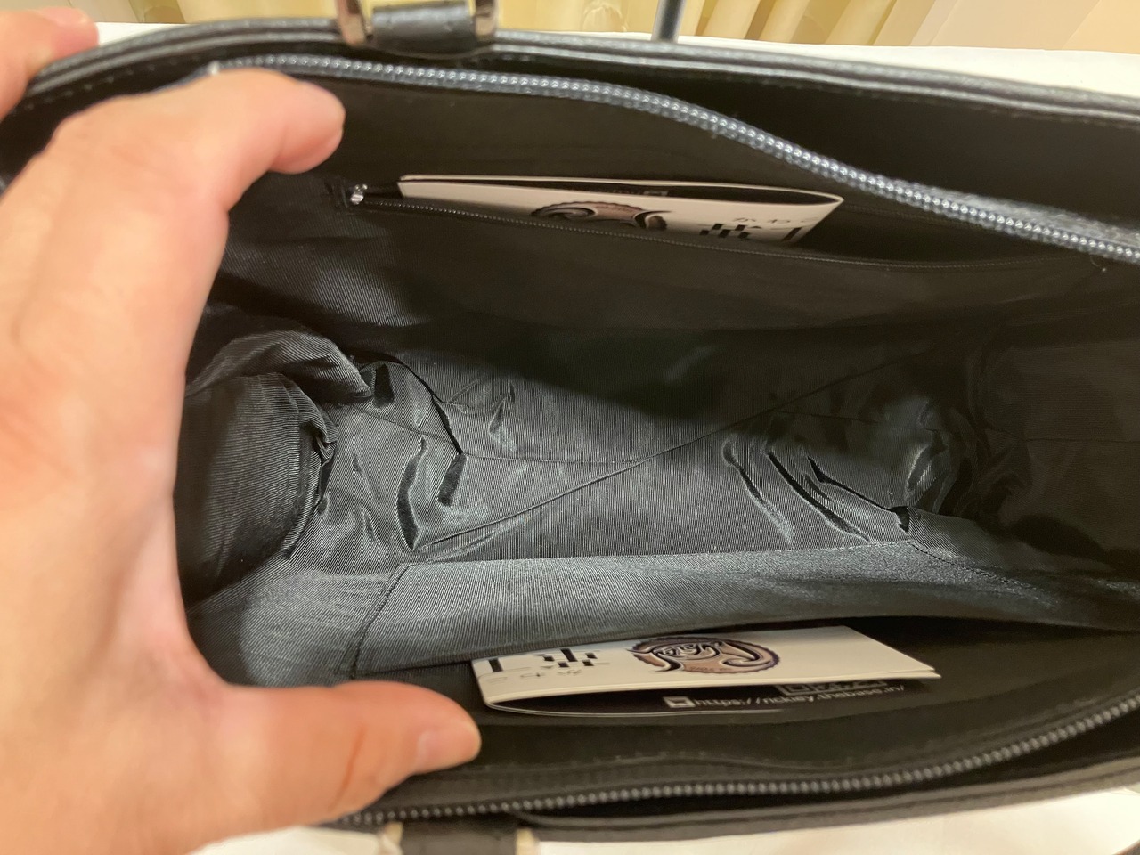 また、バッグの内側上部にはファスナーを付けて、中身が見えないよう配慮されています。タンニンなめしの革は手染めにより、使うほどに深みを増し、手にしっかり馴染む質感が魅力的。お手入れも楽で、長く愛用いただける逸品です。