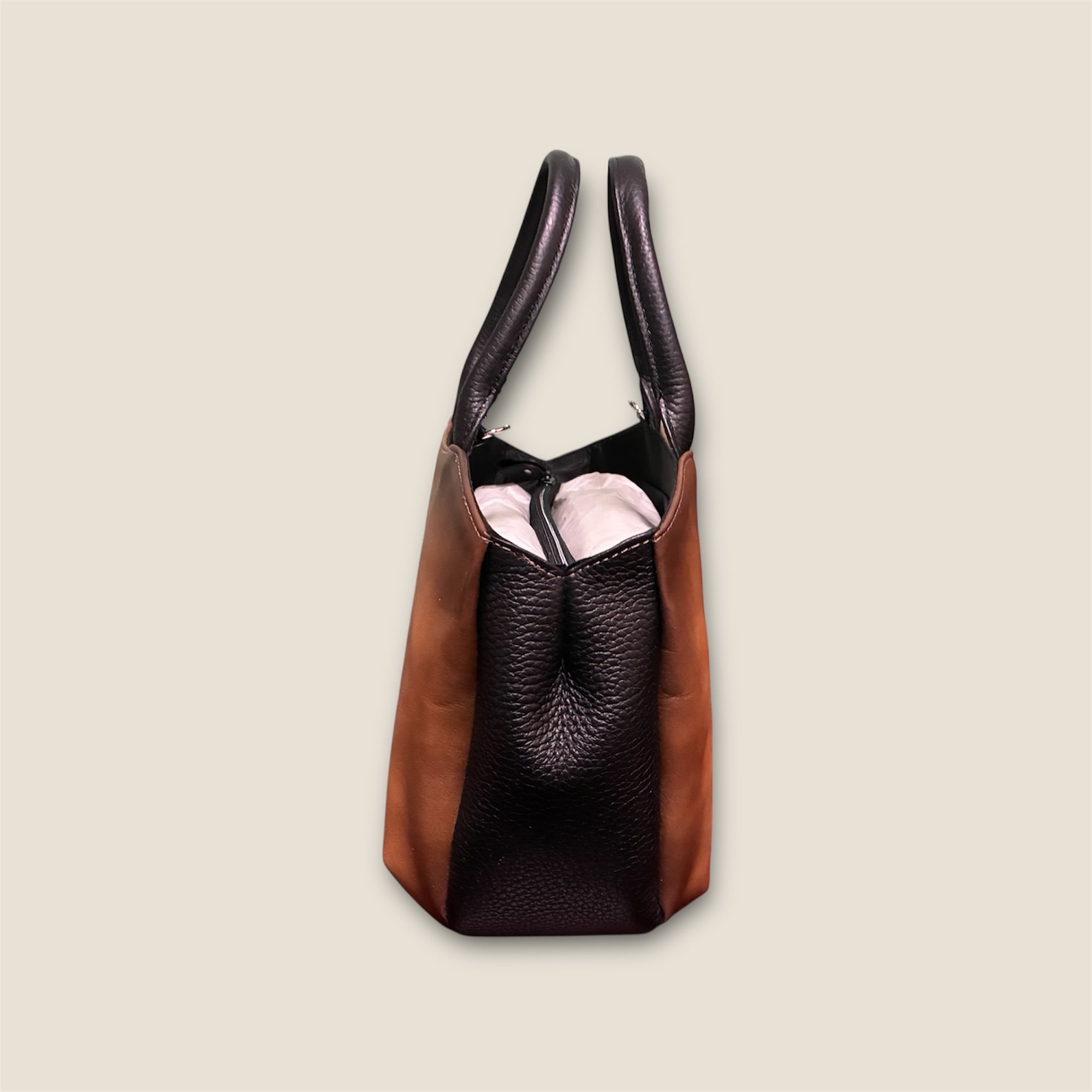 丸みのあるトートバッグです。トートバッグとハンドバッグの中間のデザインです。収納スペースが3つに分かれていて使い勝手は最高です‼️
