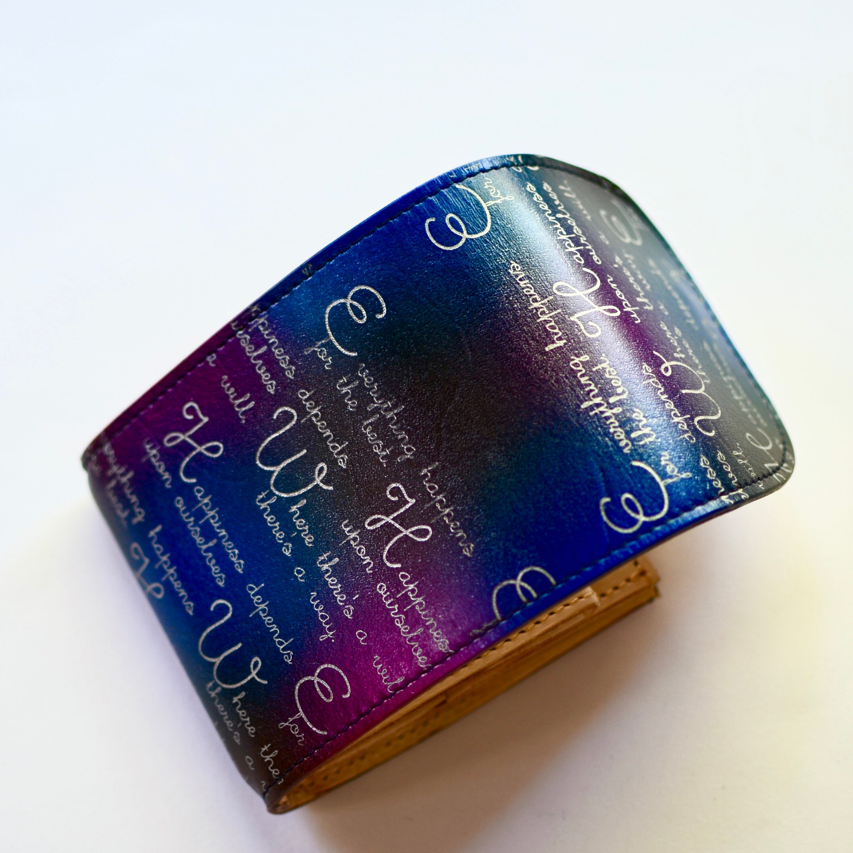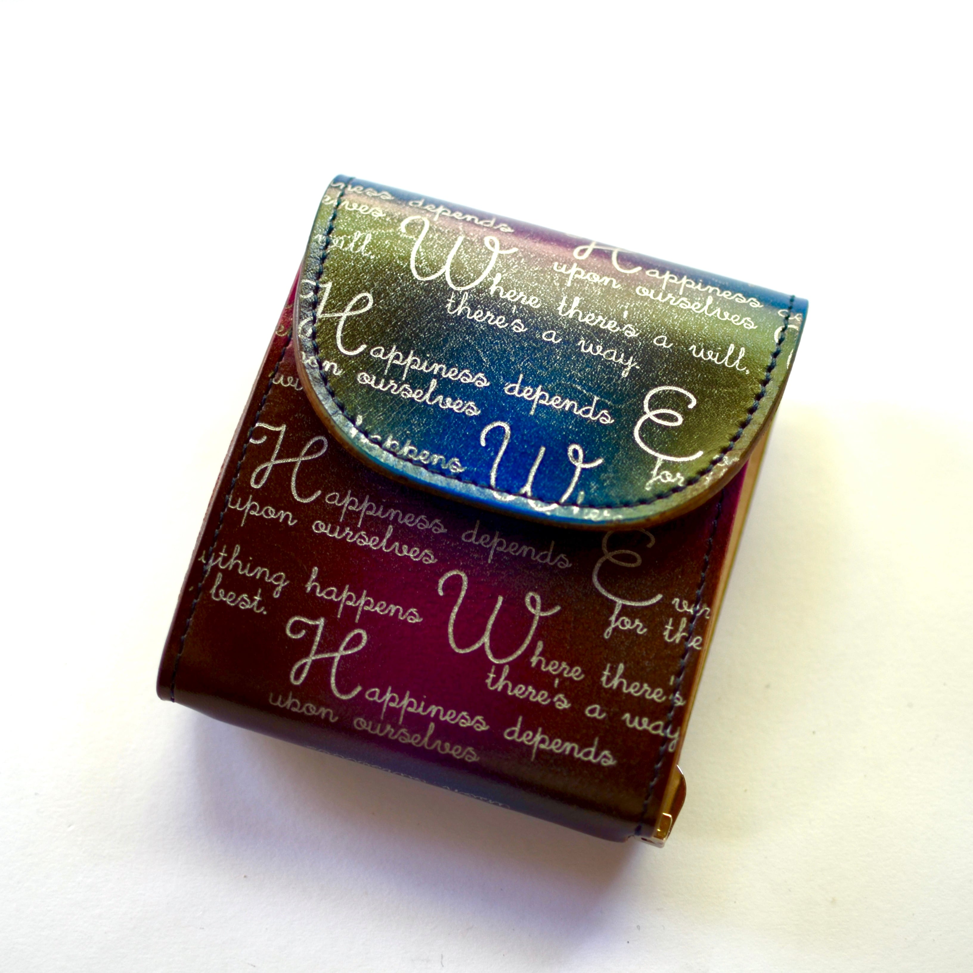 革工房Rickiey[リッキー]オリジナルのフルーティ染めを施した革に、ポジティブな言葉を彫り込んだミニ財布です。