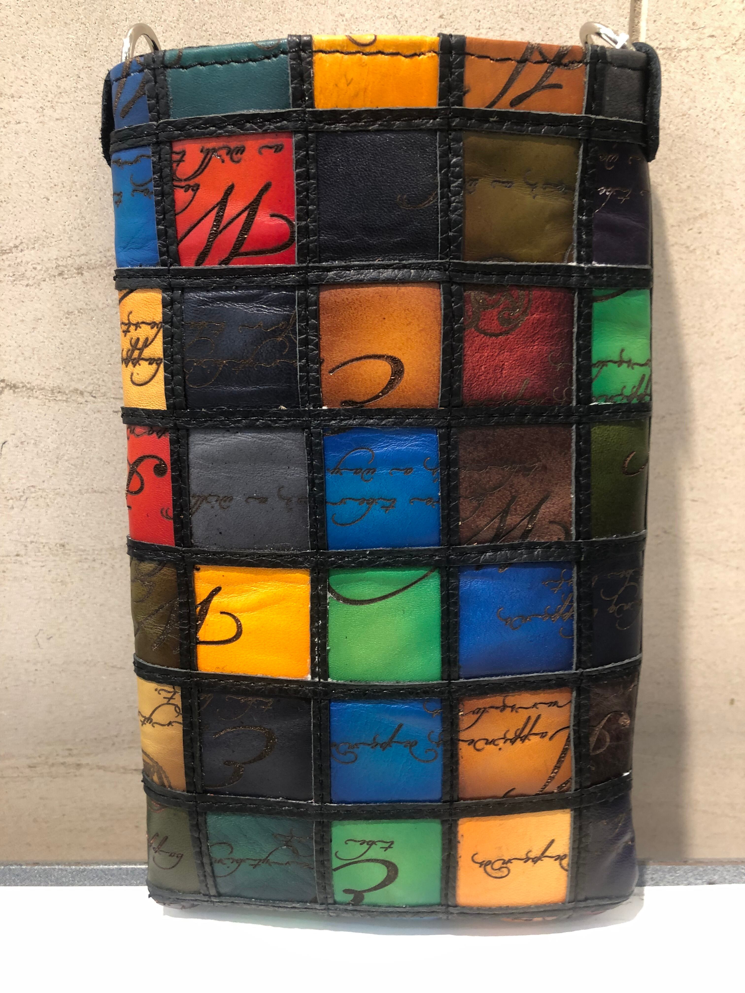 革工房Rickiey[リッキー]独自のぼかし染めを手作業で施した「牛革」を使用しました。 カラフル”増す”スマホポーチです。カラフルマスをランダム配置し持ち歩いているだけで元気になりそうなポジティブ英文を入れたデザインとなります。色合い写真の通りで既に作ったものとなります。