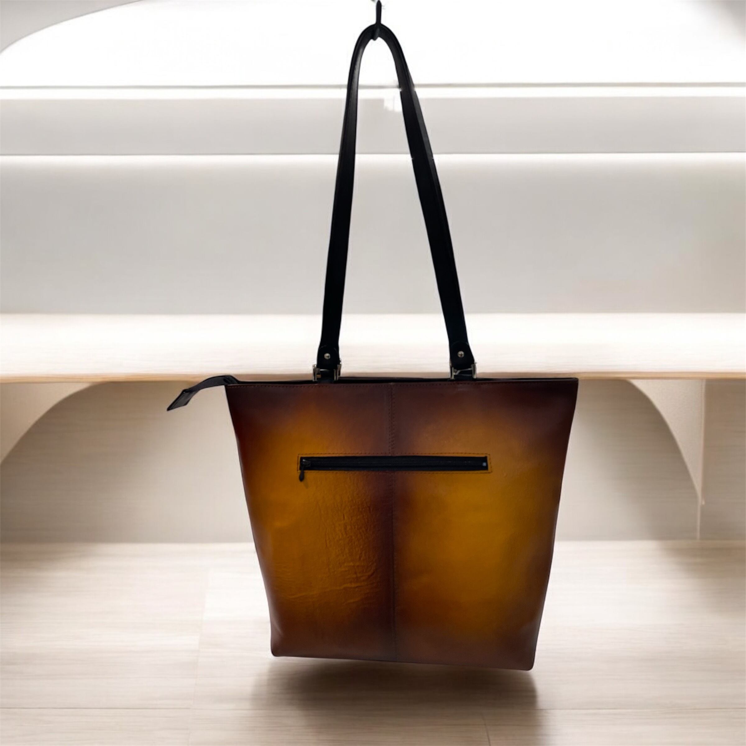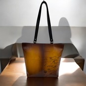 ファスナー型のトートバッグです。今までの革工房Rickiey[リッキー]独自のぼかし染めとはひと味違った更に独特なグラデーション染めを施した革を使用したトートバッグです。またこのバックにはポジティブな英文も掘り込んでいますので、一際目立つデザインとなっています。