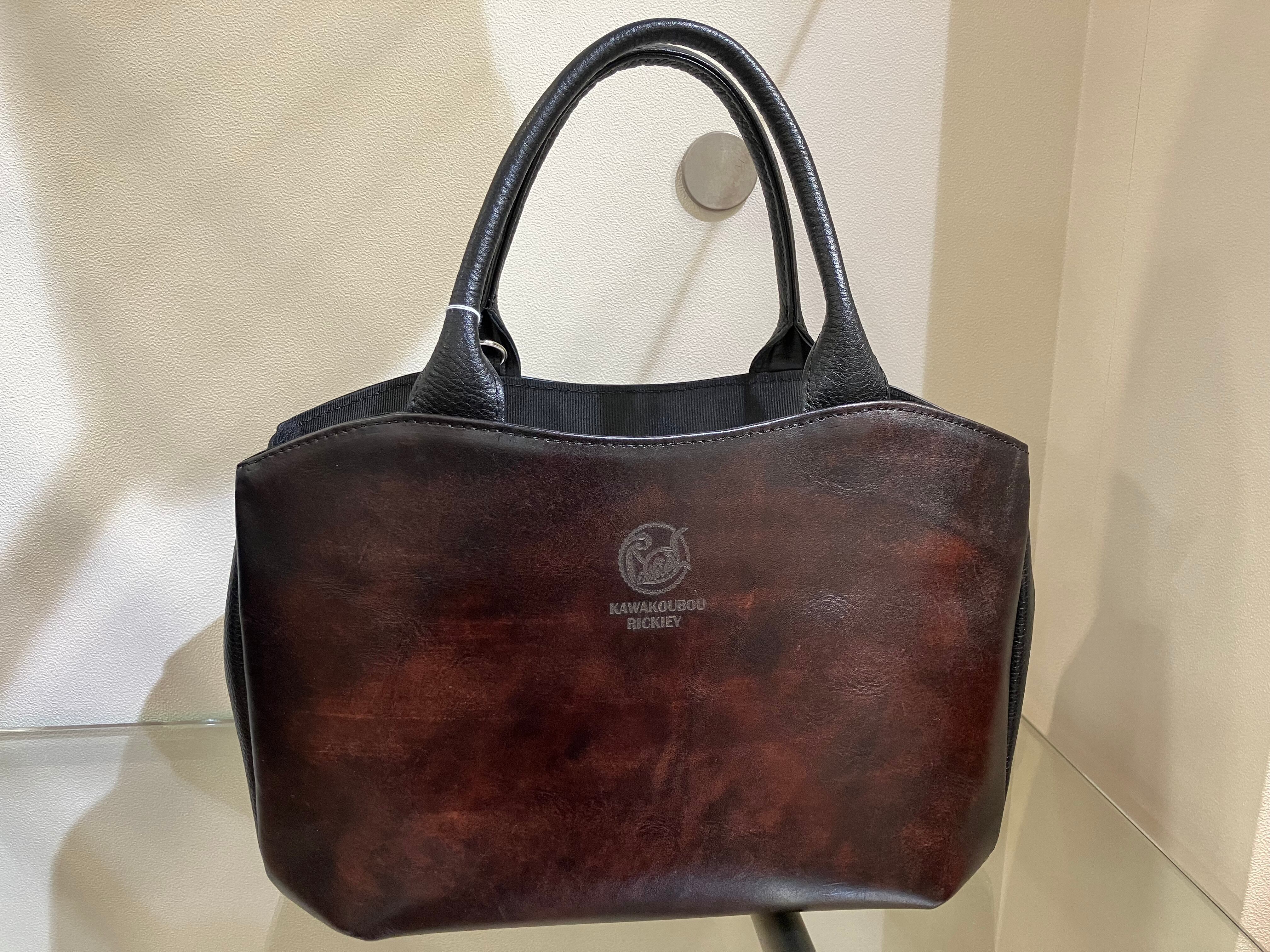 革工房Rickiey[リッキー]独自の染めを手作業でひとつひとつ丁寧に染色した牛革を使用「2WAY丸型トートバッグ(横長)」です。